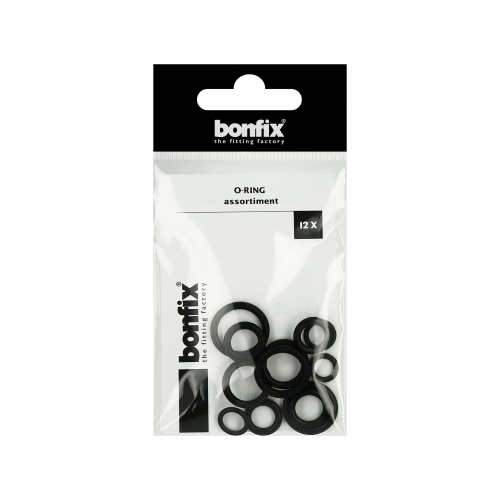Assortiment van 12 stuks o-ringen. Een o-ring is een ronde rubber pakking die wordt gebruikt om een lekvrije afdichting tussen twee onderdelen tot stand te brengen. De o-ring zit in een groef en wordt tijdens de assemblage tussen twee of meer onderdelen samengedrukt, waardoor een betrouwbare afdichting op het raakvlak ontstaat.