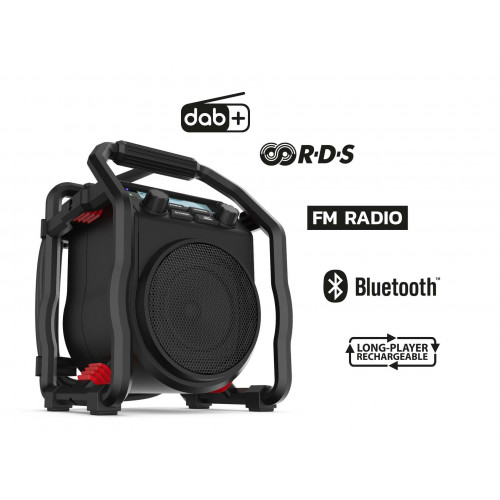 Slagvaste behuizing van ABS-kunststof LCD-scherm met achtergrondverlichting Metalen luidsprekerrooster Rubberen bedieningsknoppen Flexibele opvouwbare antenne (type KDAB8) Netsnoer van neopreenrubber Opbergvak voor snoer van 2,8 meter aan de achterkant van de radio Volledig beschermde behuizing