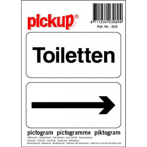 Pickup pictogram is zelfklevend, weerbestendig en eenvoudig aan te brengen. Het product heeft een direct herkenbare aanduiding en is geschikt voor iedere gladde ondergrond. Deze pictogram bestaat uit 2 afbeeldingen van 4,5 bij 10 centimeter en heeft als opdruk 'toiletten en een pijl'.