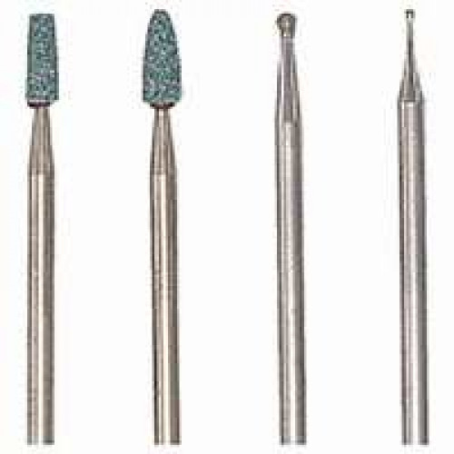 Diamantstift 1: kogel Ø 1,0 mm, diamantstift 2: kogel Ø 1,8 mm, siliciumcarbide kegel 3/2 x 5 mm, dito cilinder 2/2,5 x 7 mm. Alle schachten Ø 2,35 mm.
