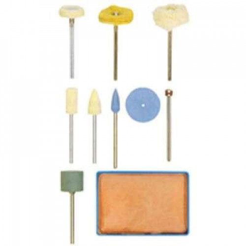 Proxxon complete polijstset, 10 delig. Voor het polijsten van metaal, glas, edelmetaal, porselein en kunststof. Bestaande uit elk 1 vilt polijststift (cilinder-, kegelen schijfvorm), 1 silicone-polijststift (projectiel-, cilinder- en schijfvorm), 1 katoenpolijstschijf, 1 wildlederen lappenschijf en polijstpasta. Incl. houder 2,35 x 44 mm.m.