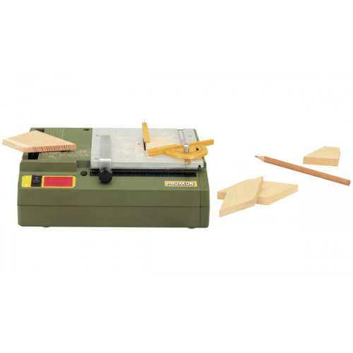 Met het bijbehorende “Supercut” zaagblad (Ø 58mm) kan zachthout tot 8mm dikte gezaagd worden. Lange levensduur, geruislozer en standvaste AC-motor. Krachtoverbrenging door tandriem en zorgt voor het juiste toerental van het zaagblad bij een ca. 2-voudig draaimoment. Zaagvermogen: in hout tot 8mm, kunststof (ook PERTINAX-platen) tot ca. 3mm, non-ferro metalen tot ca. 1,5mm.Zelfs glasvezelversterkte kunststof platen kunnen met een hardmetaalzaagblad worden doorgezaagd. Verstelbare langsgeleider met aanduiding. Hoekaanslag met gradenverdeling. Vlakgefreesde werktafel uit aluminium persgietwerk (160x160mm)