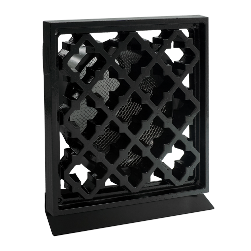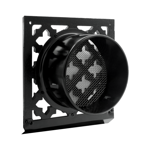 Aluminium vierkant gegoten retro design ventilatierooster, voorzijde zwart (RAL9005) met RVS metalen aansluitstuk Ø150mm, inclusief muggennet, rvs schroeven en spanveren. Ten behoeve van natuurlijke circulatie, electrische motoren, afzuigkappen met 1 of meerdere motoren.