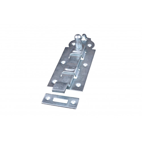 Rolschuif 140x55mm met bocht. Staal, verzinkt. Met verdekte rollen. Zwaar model. Rechthoekige grondplaat en vlakke sluitplaat, beide voorzien van verzonken schroefgaten. Vlakke schoot met bocht en gedraaide sluitknop.