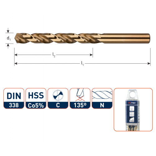 HSS-E Spiraalboor DIN 338, kort, type N, geslepen uitvoering, cobalt gelegeerd, goudkleurig, tophoek 135°, met splitpoint / kruisaanslijping (DIN 1412-C).