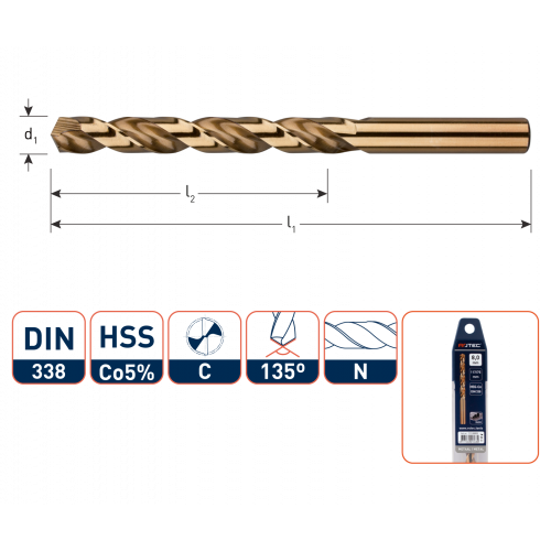 HSS-E Spiraalboor DIN 338, kort, type N, geslepen uitvoering, cobalt gelegeerd, goudkleurig, tophoek 135°, met splitpoint / kruisaanslijping (DIN 1412-C).