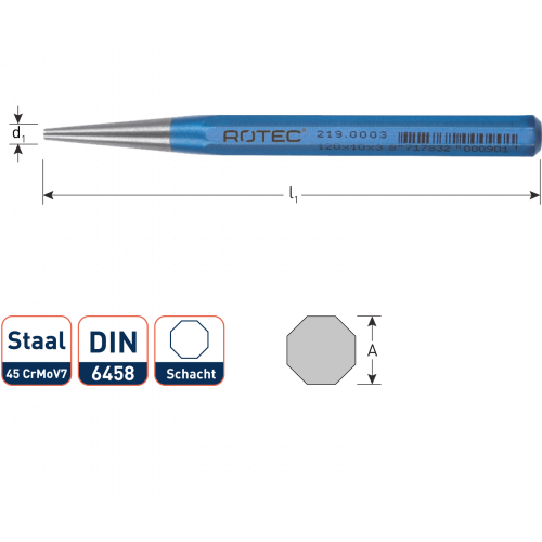 Rotec doorslag 8-kant 120 x 2 mm. Luchtgehard chroom-molybdeen-vanadium-staal 45 CrMoV7, over de gehele lengte gelijkmatig doorgehard en zorgvuldig ontlaten. Slagkop inductief ontlaten, voorkomt versplintering. Werkvlak blank geslepen en blank gelakt, snijvlakken braamvrij.