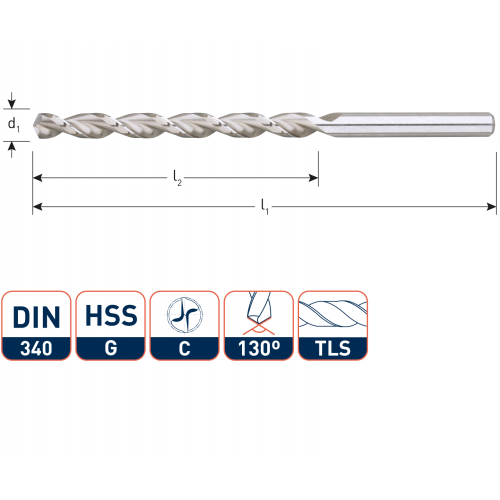 HSS-G houtspiraalboor, DIN 340 (lang), geslepen uitvoering, type TLS, tophoek 130°, kruisaanslijping volgens DIN 1412-C. De TLS-spiraal zorgt voor een zeer goede spaanafvoer bij grotere boordieptes.