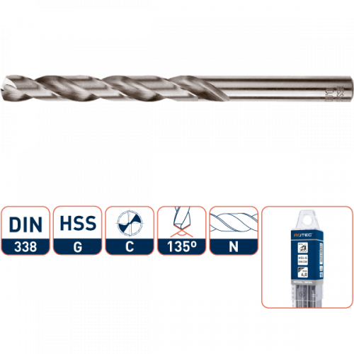 HSS-G Spiraalboor DIN 338, kort, type N, geslepen uitvoering, tophoek 135°, met splitpoint / kruisaanslijping (DIN 1412-C). Hoge precisie en standtijd.