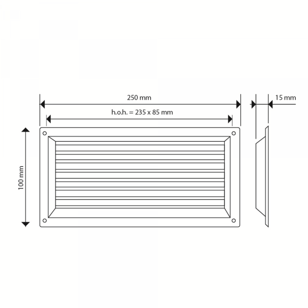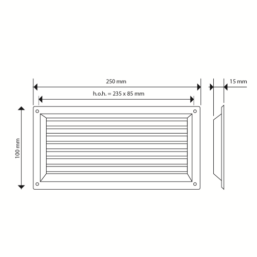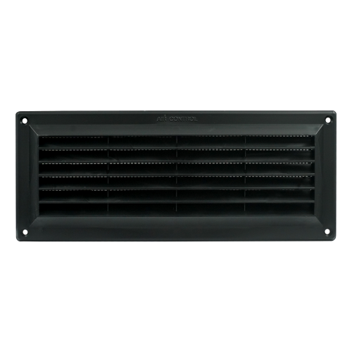 Air Control kunststof schoepenrooster zwart 250 x 100mm met vliegengaas, opbouw.