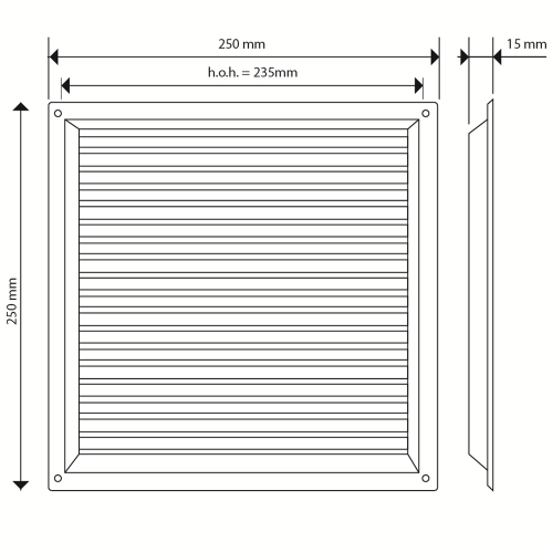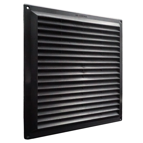 Air Control kunststof schoepenrooster zwart 250 x 250mm met vliegengaas, opbouw.
