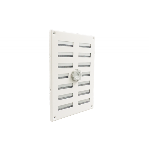 Afsluitbaar opbouw schuifrooster, aluminium wit gepoedercoat met aluminium vliegengaas.