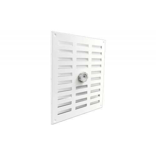 Afsluitbaar opbouw schuifrooster, aluminium wit gepoedercoat met aluminium vliegengaas.