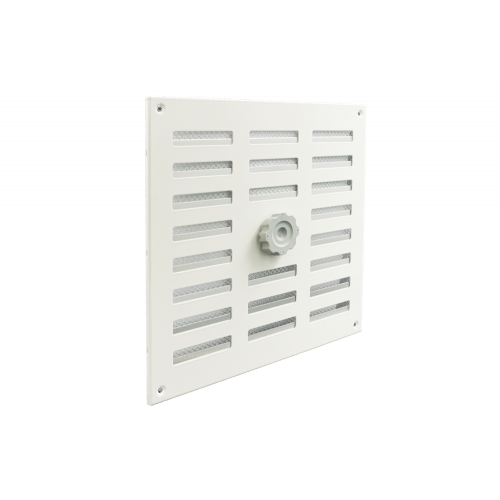 Afsluitbaar opbouw schuifrooster, aluminium wit gepoedercoat met aluminium vliegengaas.