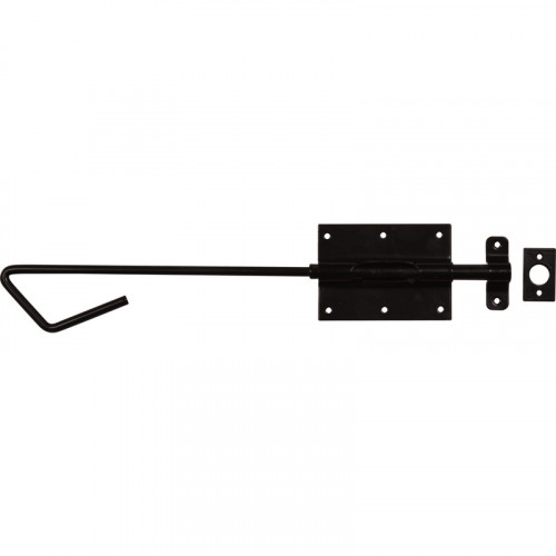 Ronde grendel, aan het einde omgebogen tot handgreep. Compleet met sluitbeugel. Grondplaat en sluitbeugel zijn voorzien van bevestigingsgaten.