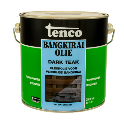 Tenco bangkiraiolie dark teak is een kleurolie, speciaal ontwikkeld om vergrijsde objecten van bangkirai, zoals tuinvlonders, schuttingen, steigers, bruggen enz. in slechts 1 behandeling weer van een natuurlijke kleur te voorzien. De kleur dark teak geeft een warme donkere teakachtige kleur welke het bangkirai weer verlevendigt. Tenco bangkiraiolie dark teak biedt op een eenvoudige wijze een prachtig resultaat. Dit uitstekende onderhoudsmiddel dringt diep in het hout en is waterafstotend. Oplosmiddelvrij, dus minder belastend voor het milieu.