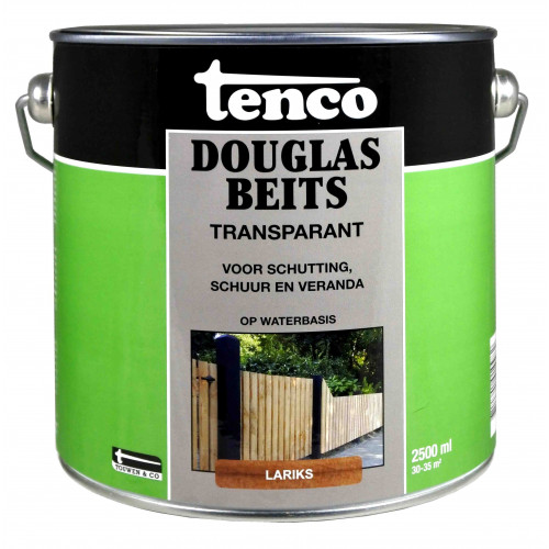 Tenco Douglas beits transparant is een duurzame buitenbeits op acrylbasis met water als oplosmiddel. Tenco Douglas beits is reuk arm en minder belastend voor het milieu. Tenco Douglas beits accentueert de houtnerf en het beschermt hout tegen weersinvloeden, het is gemakkelijk aan te brengen en sneldrogend. Verwerking mag niet in de volle zon of beneden de 10 °C. Tenco Douglas beits biedt een prima bescherming voor Douglas - en larikshout zoals; een tuinhuis, hekken, schuttingen, blokhutten en palissaden.