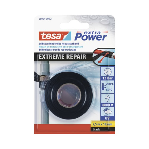 Tesa Extreme Repair is een zelfvulkaniserende tape en wordt gebruikt als niet-geleidende elektrische tape of voor tijdelijke reparatie van waterslangen en buizen.