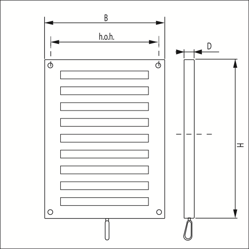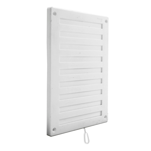 Kunststof schuifrooster wit met koord en schuif, inclusief schroeven. Afmeting: 220 x 150 mm.