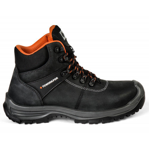 Deze zwarte werkschoen van het merk ToWorkFor type Track met veiligheidsklasse S3 heeft een composiet neus en een kevlar tussenzool. Deze robuuste hoge schoen heeft de volgende kenmerken: metaalvrije tussenzool, metaalvrij, overneus, uitneembare inlegzool, SRC. De ToWorkFor Track bestaat uit de volgende materialen: bovendeel: nubuck, voering/binnenzijde; 3D mesh, zool/onderzijde; PU/PU.