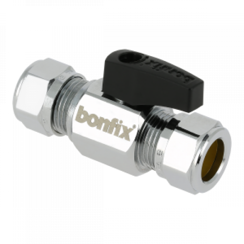 Rechte verchroomde stopkraan met zwarte bedieningshendel, 15mm knel x 15mm knel, KIWA-keur.