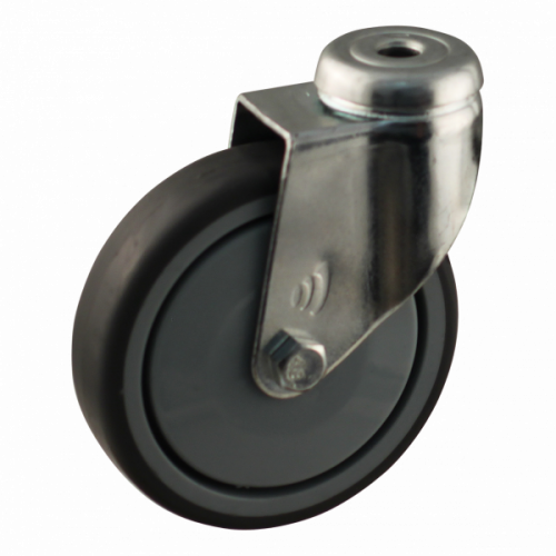 Zwenkwiel 100mm met boutgat, bestaand uit een polypropyleen (PP) velg en een thermoplastisch rubberen (TPE) loopvlak. Dit zwenkwiel is uitgerust met een kogellager. Het draagvermogen is 70kg. Deze wielen worden voor veel verschillende toepassingen ingezet, waaronder op kantoor, in winkels of op beurzen onder bijvoorbeeld rekken en displays en voor licht industriële toepassingen.