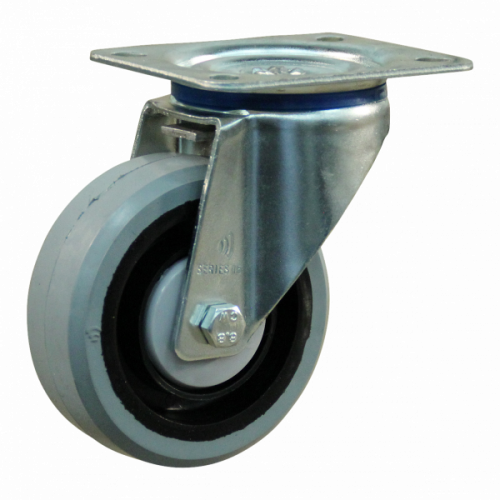 Zwenkwiel 100mm met een zwarte kunststof poly-amide velg met een opgevulkaniseerde, grijze, niet-strepende elastische rubberen band. Deze transportwielen zijn uitgevoerd met een tweezijdig afgedichte kogellager. Daarnaast zijn ze voorzien van grijze afdichtende naafkappen. Omdat deze wielen een streepvrije band hebben, zijn ze ideaal voor gebruik op (gevoelige) vloeren in bijvoorbeeld grootkeukens en showrooms.