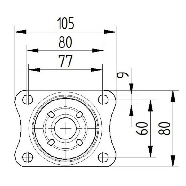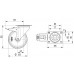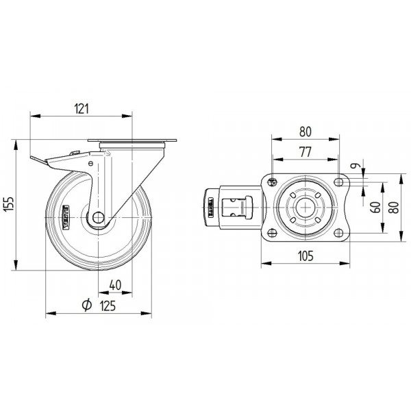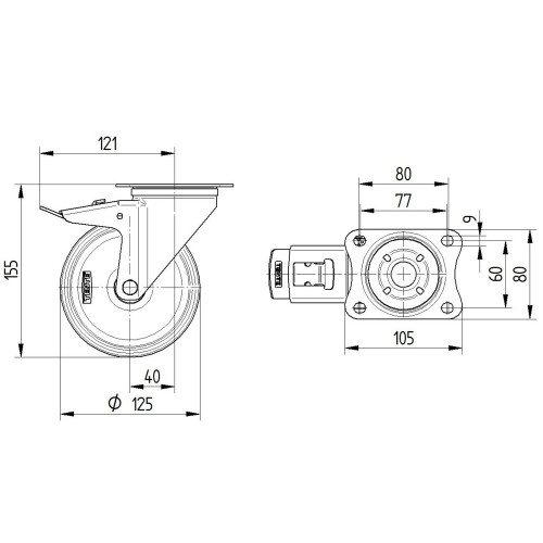 Zwenkwiel 125mm met rem. Vork van geperst staal, verzinkt, dubbele kogeldraaikrans in de zwenkkop, wielas geschroefd, stofafdichting, plaatbevestiging.