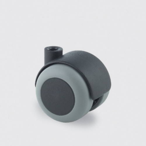 Dubbel zwenkwiel 50mm, vork van polypropyleen, met gat voor meubelwiel bevestigingen. Wielkern van polypropyleen met grijze niet-strepende tenteprene thermoplastische rubberband, wielnaaf op glijlager.