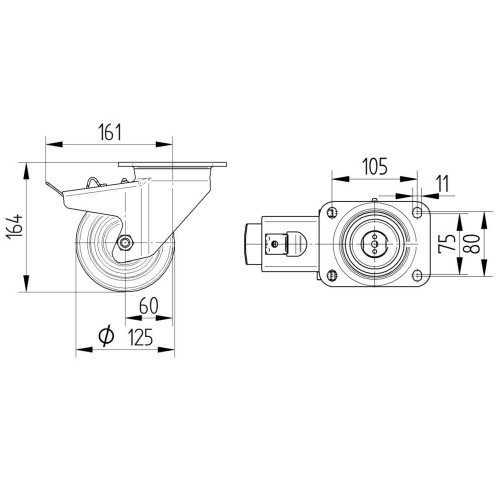 Zwenkwiel geremd, met vork van extra zwaar geperst staal, verzinkt-chromatiseerd, voorzien van dubbele, geharde kogelbanen, met versterkt en warmtebehandelde lager stof afdichting met geïntegreerde smeernippel, centrale pen geklonken, wielas geschroefd, plaatbevestiging.