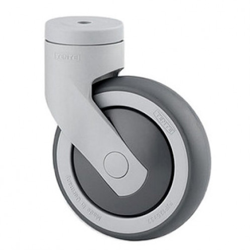 Zwenkwiel 100mm, vork en wiel van hoogwaardig synthetisch materiaal, zwenklager met dubbele kogeldraaikrans en boutgat.